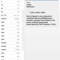 Access over 7000 Hebrew words used in the Bible. Find full meanings, Strong's number relation, part of speech and English transliteration. Link from one word to similar meaning ones.