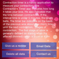 Contractions Timer is the application to track labor contractions. The track is easy by just pressing. At the start and stop button The contractions overview labor data in a format easy to read display. A good overview is easy to determine when to. Doctor / midwife consulted In the same survey, it is also possible to call to the midwife. The song is easy to insert and always at hand. The overview is to export. Via email