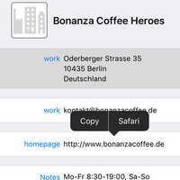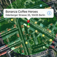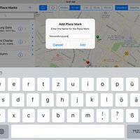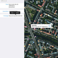 • Side-by-side view (iPad only) of the address book and the map. You can highlight a contact’s map annotation by tapping the address in the contact’s detail page. Vice versa you can show the address book page by selecting a map annotation and tapping the disclosure button.