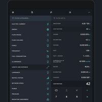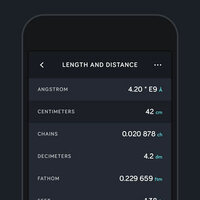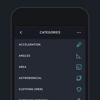 Categories Amount Plus can handle: Acceleration, Angles, Area, Astronomical, Clothing (men and women), Cooking, Currency, Data, Density, Electric current, Energy, Flow (mass and volume), Force, Frequency, Fuel Consumption, Illuminance, Length and Distance, Luminance, Metric System, Network speed, Power, Pressure, Radiation, Sound, Speed, Temperature, Textile Yarn, Time, Torque, Transportation Cost, Typography, Viscosity (dynamic and kinematic), Volume, Weight and Mass.