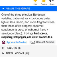 • Decanter Magazine: "Dozens of apps offer background details on regions, varieties, and food pairings, but some are more accurate and usable than others. Approach Guides is the most complete and user-friendly. You can search by style, region, grape or food match, and entries are cross-referenced. It also supplies a guide to vintages for each region and plentiful maps..."