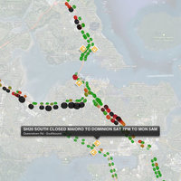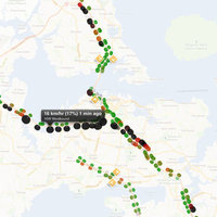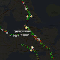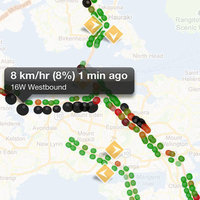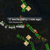 Tap on the road sensor sites (light gray dot) to show the average speed, % speed of posted speed limit and age of the last estimate.