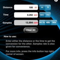 Convert delay times to distance and vice-versa. Conversion between distance in meters or feet, time in seconds or milliseconds, and number of samples (can use different sample rates of 44.1,48 and 96kHz).