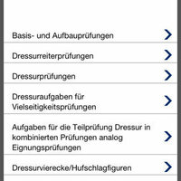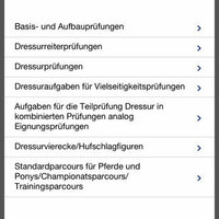 Die App „Aufgaben Reiten“ enthält neben den verschiedenen Aufgaben zu Basis- und Aufbauprüfungen, Dressurprüfungen, Vielseitigkeitsprüfungen auch Standardparcours sowie Abbildungen der Dressurvierecke und Hufschlagfiguren.