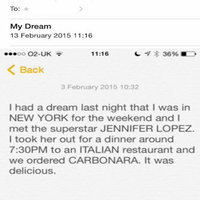 I had a dream last night that I was in Paris for the weekend and I met the superstar JENNIFER LOPEZ. I took her out for dinner to an Italianrestaurant around 7:30 and we ordered Lasagna. It was delicious.