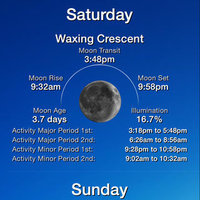 - Exclusive celestial information from sunrise, sunset, moonrise, moonset to major and minor periods information used by fishermen and hunters.