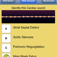 This program strives to present to its users a wide collection of bodily sounds in a test format. Questions and answers are grouped together and alternated on the screen. Users listen to sounds and press on one of four buttons to select the choice they feel best answers the question "what sound do you hear". Questions are randomized and presented in a given period of time. Then the exam is scored and the results are presented to the test taker. The number and percent correct are shown as a bar graph. The incorrect and skipped questions are listed so that users can review those questions they did not choose properly.