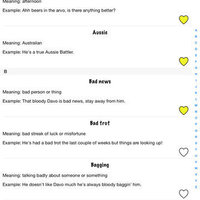 The audio will not only help you understand the lingo's meaning but also provides a clear example of how us Aussies pronounce words and the Aussie twang we are known for.