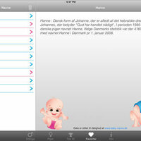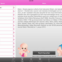 Med Babynavne app'en finder du danske navne til dit barn. App'en indeholder beskrivelser samt detaljer om de enkelte navne således du også får viden om navnet inden du vælger. Desuden indeholder app’en lister over de mest populære drenge- og pigenavne for de sidste 10 år. Du har også mulighed for at lave din egen liste med dine favorit navne således at du ikke glemmer et flot navn du har fundet. Det er nemt at navigere i app'en med alfabetisk inddeling af navnene samt mulighed for at søge efter bestemte navne.