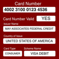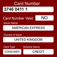 This incredibly easy to use application lets you view Credit or Debit Card Issuer data on your iPhone as well as validating the card number. The App interrogates its internal database of Card Issuer data to tell you the name of the bank or financial institution, the country the card was issued in, whether the card is a consumer or corporate account and the scheme type (VISA Credit, VISA Debit, Mastercard Credit, Maestro etc) .