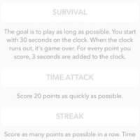 1. Survival - You start with 60 seconds on the clock. When the time runs out the game is over. For every scored point, 3 seconds are added to the clock. The goal is to survive as long as possible.