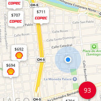 Bencina en Línea detecta tu ubicación y despliega rápidamente las alternativas de precios junto al mapa de estaciones cercanas.