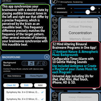 35 Multi-Stage Binaural Programs Combined with Included Ambient Music, Nature Sounds, or your own iTunes Music * A Broad Range of Binaural Programs for Sleep, Focus, Memory, Energy, Positive Mood, Confidence, Anxiety Relief, Stress Relief, Relaxation, Meditation and much more! * Use the Included Playlist Creator to create an iTunes Playlist for each Program * Use with apps like Spotify, TuneIn, Podcasts, or Audio Book Readers * Universal iOS app with UIs included for iPad, iPhone/iPod Touch, iPhone 5/6/6+/6s/7 so you get it across all your devices! * Supports Family Share * Different states of mind are associated with specific brainwave frequencies that would be inaudible if played directly. These frequencies can be induced in the brain by indirectly by playing two different audible binaural tones into each ear, which after being processed by the brain, are perceived as an inaudible low frequency beat matching the target brainwave frequency. As you listen, your brainwaves fall into step with this inaudible binaural beat, and after a few minutes synchronize with the target brainwave frequency. Brain Wave's 32 included programs layer these tones and binaural beat sequences into multi-stage experiences to create complete Brainwave Entrainment sessions that have helped thousands of people focus and concentrate, feel positive and motivated, and sleep more soundly.