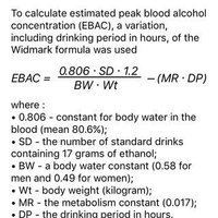 The application is designed to calculate the maximum concentration of ethanol in the blood after a predetermined number of instantaneous consumption of alcoholic drinks, as well as time of its removal from the body.