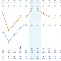 In the section “14-daagse” (14 day forecast: below in the menu bar) you can find the weather forecast (in a graph) for the upcoming 14 days. You can also see a detailed view in the tab “Lijst” for an hour-to-hour prediction for the next 7 days and a daily average for the following 7 days.