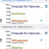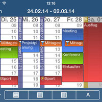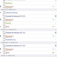 CalenGoo also has a month view similar to that of Google Calendar. It can be zoomed and panned to quickly get an overview over the events of a month. Zooming the month is done by using the two-finger-zoom gesture that you know from Safari and the photo application. A double tap opens the tapped day.