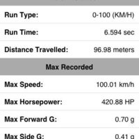 - Zoomable (to 3x) performance graphs: Speed, Acceleration, G-forces (front, back, right and left), Horse Power, Distance traveled