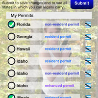 UNIQUE: This application comes with a convenient map, useful in planning a trip. Choose (and save) your current license or permits (both Resident and Non-Resident) to see which states recognize YOUR permits. Shows a map (and list) of States in which YOU, specifically, can legally carry. See, at a glance, states in which to plan your next vacation, or plan your interstate-travel to avoid locations where you cannot carry. Type in and save details and notes for each permit.