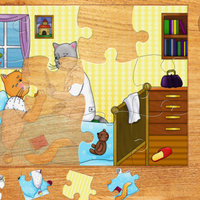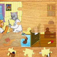 - puzzle przedstawiające ilustracje ze wszystkich książeczek, dostępne są w trzech poziomach trudności i uzupełnione o podpowiedzi oraz dźwięki