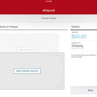 • Deposit Canadian dollar cheques by simply taking a picture with your device.