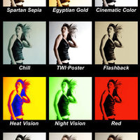 20 effects including Spartan Sepia, Egyptian Gold, Cinematic Color, Chill, TWI·Poster, Flashback, Heat Vision, Night Vision, Red, Flashback Glow, Elf Glow, Charmed Glow, Dark Comic, Color Comic, Surveillance Cam, Victorian, Dark Night, Vampire World, WWII, Kyoto