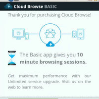 The Basic download gives you 10 minute browser sessions, which is perfect for catching up on news, watching short videos, looking at restaurant menus, and other light browsing activities. You can upgrade to Unlimited and Premium service levels for increased performance and unlimited browser sessions if you want to use Cloud Browse to play Flash games, view longer videos, or engage other higher bandwidth content on the web.