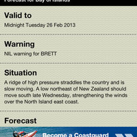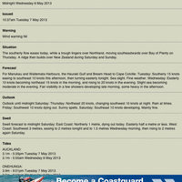 Coastguard Nowcasting broadcasts real-time marine weather information and forecasts, personalised to your location (within the Northern Region);