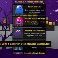 Do you want to learn how to count back change while playing money math games with monsters? Learn counting money, money math, with three different money math games. The easy to use coin counting interface of Coin Monsters makes it perfect for kids and adults to learn how to count coins and memorize U.S. coins and their values like the Penny, Nickel, Dime and Quarter. Unlock additional coin counting game levels as you progress to expand the game to eight different coin & money game levels. Challenge your coin counting and money math skills, see if you can beat The Count and become a Coin Counting Champion!