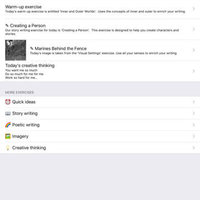 Each day you get presented with a set of writing exercises designed by international poet and workshop leader Emmanuel Williams. You can either follow these exercises or choose from a complete list of exercises. As you follow an exercise anything you write is saved so you can easily find it later. If you like what you've written you can email it to yourself or paste it into another app such as a word processor.