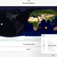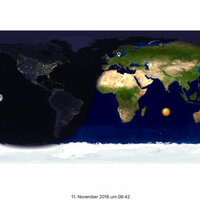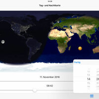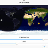 A world map that shows the regions of day light and night. It updates once every minute. Date and time of day can be selected.