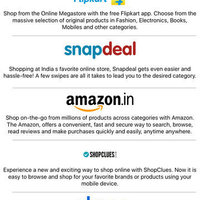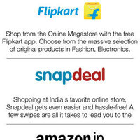 This simple but elegant Online Shopping app is very useful for you to find and shop over 100s of top Ecommerce websites in India. App contains quick links, deals, offer and coupons from top shopping websites including Flipkart, Amazon, Snapdeal, Ebay, Paytm, Shopclues, Jabong, Myntra, Zovi, Shoppers Stop, Trendin, Bewakoof, Lenskart, Yepme, Naaptol, Homeshop18, Infibeam, Rediff Shoppping, The Mobile Store, Indiatimes Shopping, Saholic, Cyberplace, Univercell, Fashion And You, Latest One, Firstcry, Hopscotch, Yappa, Babyoye, Junglee, Groupon, Olx, Quikr, Zoomin, Healthkart, Book Adda, Pepper Fry, Dominos, Foodpanda, KFC, Pizzahut, Justeat, Zomato, OLA, Uber etc.