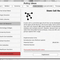 Each policy (or law) in the game has a slider which allows you to fine tune it's intensity to get the balance just right. A series of equations within the game allows the same policy to have radically different effects on each voter group at different points in the slider, so some voters may be indifferent to a policy unless it reaches extreme levels, for example. Democracy 3 also models the global economy, including credit rating agencies and debt interest levels, as well as the impact of global events on your country.