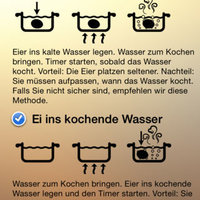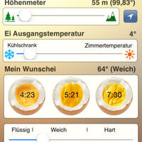 Usage: In order to measure the exact size of your egg, simply place it on your iPhone and set the size using your fingertip for. Determine your current altitude (or let it be determined by GPS), tell your iPhone if you kept your eggs in the freezer or at room temperature and how you would like to have your eggs – soft-boiled, hard-boiled or something in-between.