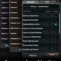Create the perfect atmosphere using Sound effects, environmental soundscapes, music tracks and make your life easier with our dice rolling system.