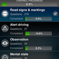 * Practice Theory Test: Test your knowledge by practicing by categories. You can select one or more categories to practice. You can also perform rapid tests for 10, 20 or 30 questions. In this section there is no time limit and you can see the official explanation before selecting the correct answer.