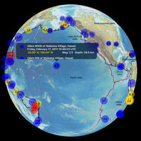 Recent earthquake data is obtained from a USGS data feed and is updated every 5 minutes (requires an internet connection). Data controls allow the user to select a combination of earthquake magnitudes, focus depths and times (one day to one week). Recent volcanic activity or historical earthquake data may also be displayed. Map controls allow you to select which type of plate boundaries are displayed as well as different maps that show physiographic features, continents, or countries. Explore the relationship between earthquakes, volcanoes and tectonic plate boundaries by dynamically selecting these features.