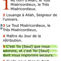 Le Coran est divisé en chapitres appelés sourates, au nombre de 114 et débutant par la première appelée Al Fatiha (parfois traduite par « la liminaire » ou « le prologue » ou « l'ouverture » ou encore « la mère du livre »). Ces sourates sont elles-mêmes composées de versets nommés âyât (pluriel de l'arabe âyah, « preuve », « signe », et que l'on retrouve notamment dans le mot ayatollah). Les versets sont au nombre canonique de 6 236 pour le hafs (lecture orientale) et 6 213 pour le warch (lecture occidentale).