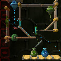 Enigmo is a 3D puzzle game where you direct animated streams of flowing liquid so that the droplets get to their destination. Water, Oil, and Lava fall from Droppers and bounce around the walls of the puzzle. You move and rotate various types of bumpers, sliders, accelerators, and sponges in order to divert the flow of the falling droplets. The faster you complete each of the 50 levels, the more bonus points you receive.