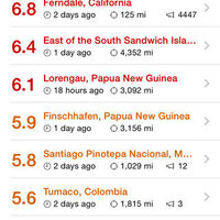 Displays all of the USGS 7-day most recent earthquakes around the world with magnitudes 2.5+ for the US and 4.5+ for the world.