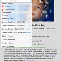 Multiple ways to switch a Bible chapter or article you are reading between different languages. Tight integration with the iOS dictionary, with WOL.jw.org, with the Insight Volumes, and with Pleco. Those in the Chinese foreign language field get access to to auto-generated Pinyin, Zhuyin and Sidney Lau above the characters, or toggle the characters on/off.