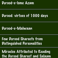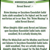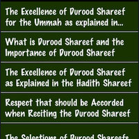 Excellence Of Durood (Salawat) for ipad This book contains valuable information about Durood Shareef (Salawat) on Sayyiduna Rasoolullah (Sallallaahu Alaihi Wasallam). The message of Allah (SubhanaHu Wa Ta'la)to Sayyiduna Rasoolullah (Sallal Laahu Alaihi Wasallim) has come down to us in the form of the Holy Quran and the teachings of Sayyiduna Rasoolullah (Sallal Laahu Alaihi Wasallim) have reached us in the form of the Ahadith. Let us see what both the Holy Quran and Ahadith say about Durood Shareef(Salawat): Innal llaha wa Malaa'ikatahu Yu salluna allan nabiyi. Ya Ayyuhal lazeena aamanu sallu alaihi wasallimu tasleema. Almighty Allah says: "Surely Allah and His Angels send blessings on the Holy Prophet (Sallal Laahu Alaihi Wasallim). O you who believe! Send Blessings (Durood) and Salutations (Salaams) on the Prophet with worthy Salutation".(Surah al-Ahzab: 56)