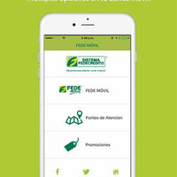 Descripción: Con el servicio FEDE MÓVIL se puede tener acceso a productos financieros tales como depósitos, préstamos, tarjetas de crédito y remesas familiares de las Entidades Socias y por tanto, podrán realizarse transacciones con productos propios y de terceros; y además podrá realizar pagos de colectores y consultas de saldos de los productos. Todas las transacciones son en línea de manera rápida y segura; asimismo se podrán consultar ubicaciones de puntos de servicio y promociones en comercios afiliados al Programa de Lealtad del SISTEMA FEDECRÉDITO. Para el acceso al servicio, el cliente deberá de firmar un contrato en la Entidad Socia y se crearán los usuarios y claves para los efectos del acceso.,