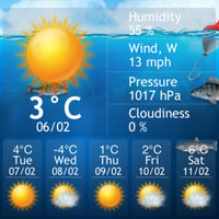 Not only you get the best fishing dates and times, but also you will be always ready for any weather conditions with the weather forecast: get temperature for the next five days, humidity, cloudiness, wind and pressure.