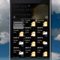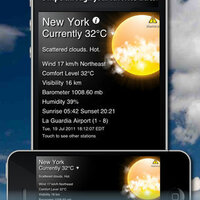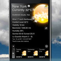 Information provided includes high and low temperatures (C or F), wind speed and direction (km, miles, knots, m/s or beaufort), precipitation probability, comfort level, humidity, visibility, UV levels and the barometer reading (Millibars or Inches). Touch the (i) to add cities or change your settings.