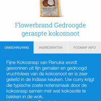 - Per product vind je een foto, product omschrijving, een ingrediënten lijst en een Fodmap informatie tab. (indien van toepassing op het product, vind je hier bijvoorbeeld een beperking van de hoeveelheid van het product).