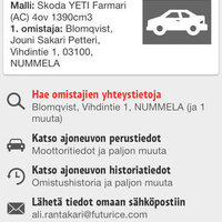 Rekisterinumeron perusteella saat tietoosi mm. auton omistajatiedot sekä teknisiä tietoja kuten merkin, mallin, omistajan kotipaikkakunnan ja ajoneuvon käyttöönottopäivän. Rekisterinumerohaut ovat maksullisia, suoritetaan sovelluskaupan kautta.