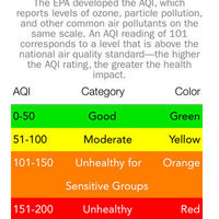 What is AQI? The AQI (air quality index) reports levels of ozone, particle pollution, and other common air pollutants on the same scale—the higher the AQI rating, the greater the health impact. The AQI is divided into color-coded categories; the categories are intended to convey information about how air quality within each category relates to public health.