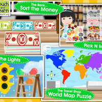 Fun Town is simple, educational fun for young kids. Scroll along Main Street and interact with the various shoppers and vehicles. Choose one of the 14 the shops you’d like to visit - each is it’s own mini-game;