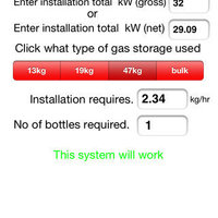 This also has conversion tables to change from any of the figures, m3/hr to kW gross to kW net to KG/hr and will also tell you how many gas bottles are required for an install dependant on their size.
