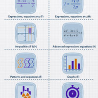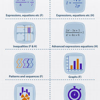 Expressions, equations, inequalities, advanced expression equations, patterns and sequences, graphs.